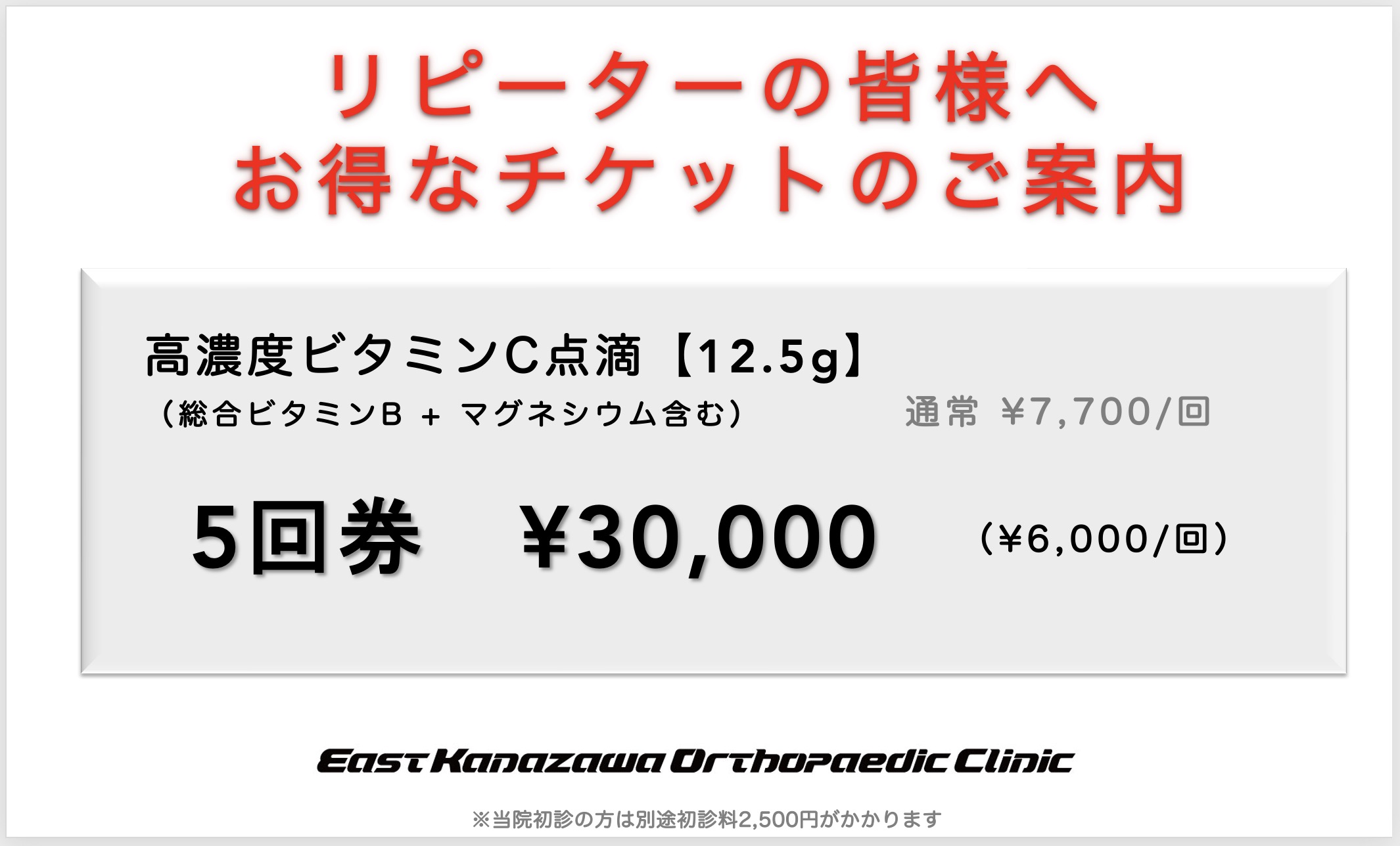 | 高濃度ビタミンC (12.5g)点滴 (ビタミンC 12.5g + 総合ビタミンB + マグネシウム含む) |
